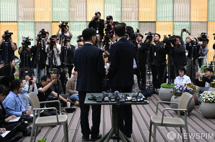 [서울=뉴스핌] 최지환 기자 =김문수 국민의힘 대선후보와 한덕수 무소속 예비후보가 8일 오후 여의도 국회 사랑재에서 단일화 관련 회동을 하고 있다. 2025.05.08 choipix16@newspim.com