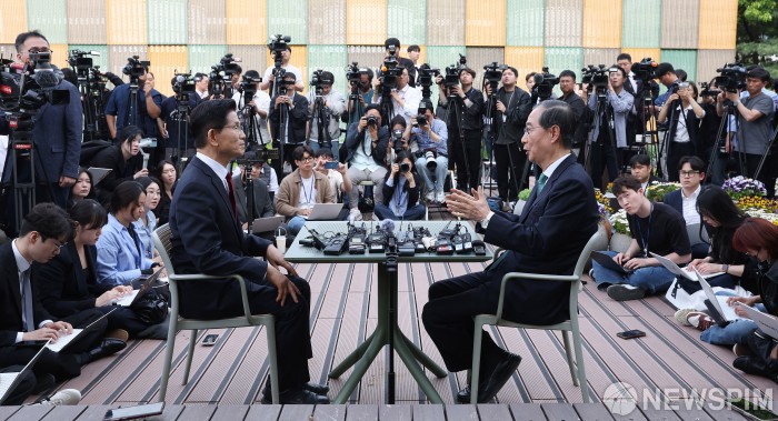[서울=뉴스핌] 최지환 기자 =김문수 국민의힘 대선후보와 한덕수 무소속 예비후보가 8일 오후 여의도 국회 사랑재에서 단일화 관련 회동을 하고 있다. 2025.05.08 choipix16@newspim.com