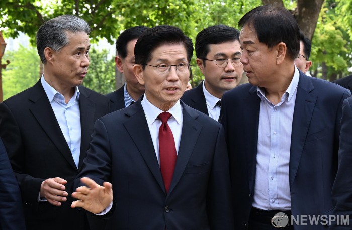 [서울=뉴스핌] 최지환 기자 =김문수 국민의힘 대선후보가 8일 오후 한덕수 무소속 예비후보와 단일화 관련 회동을 위해 이동하고 국회 사랑재로 이동하고 있다. 2025.05.08 choipix16@newspim.com