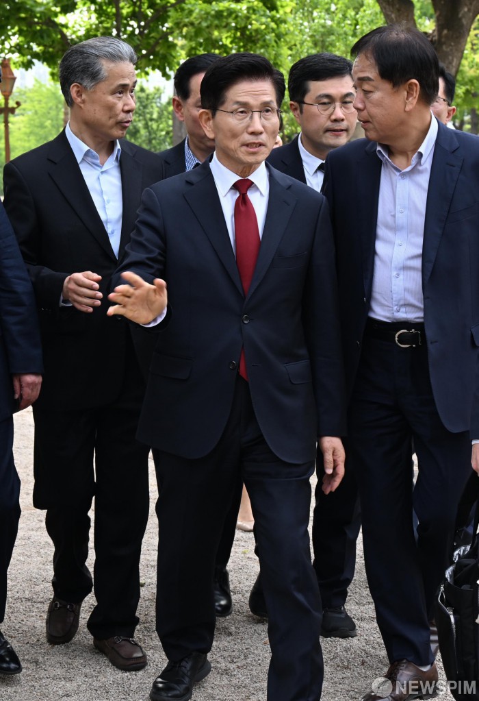 [서울=뉴스핌] 최지환 기자 =김문수 국민의힘 대선후보가 8일 오후 한덕수 무소속 예비후보와 단일화 관련 회동을 위해 이동하고 국회 사랑재로 이동하고 있다. 2025.05.08 choipix16@newspim.com