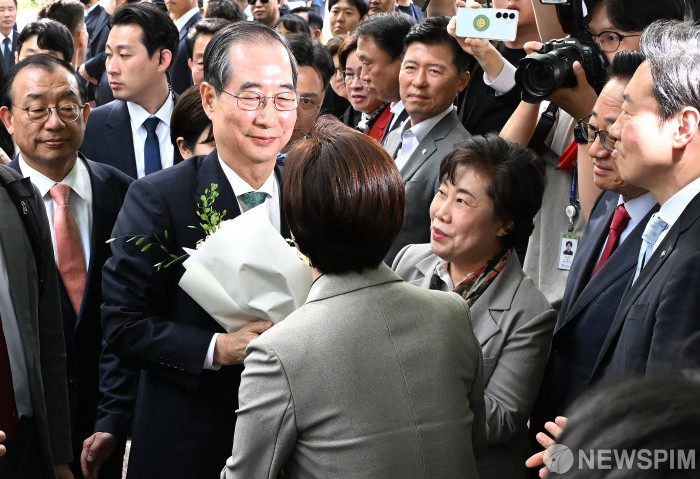 꽃다발 받는 한덕수 후보