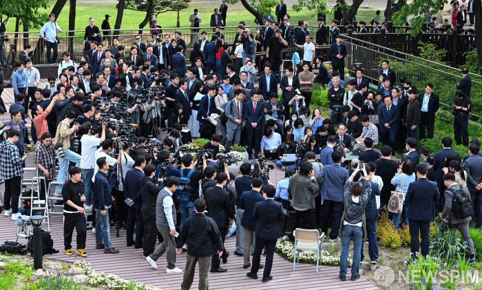 [서울=뉴스핌] 최지환 기자 =김문수 국민의힘 대선후보와 한덕수 무소속 예비후보가 8일 오후 여의도 국회 사랑재에서 단일화 관련 회동을 하고 있다. 2025.05.08 choipix16@newspim.com
