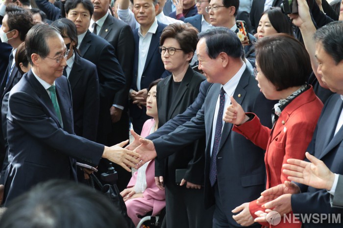 [서울=뉴스핌] 최지환 기자 = 한덕수 무소속 대선 예비후보가 8일 오후 서울 여의도 국회 강변서재에서 열린 김문수 국민의힘 대선 후보와 단일화 관련 회동에 참석하며 국민의힘 의원들과 인사하고 있다. 2025.05.08 choipix16@newspim.com