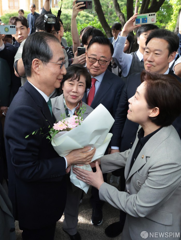 [서울=뉴스핌] 최지환 기자 = 한덕수 무소속 대선 예비후보가 8일 오후 서울 여의도 국회 강변서재에서 김문수 국민의힘 대선 후보와 단일화 관련 회동에 참석하며 국민의힘 의원들이 준비한 꽃다발을 받고 있다. 2025.05.08 choipix16@newspim.com