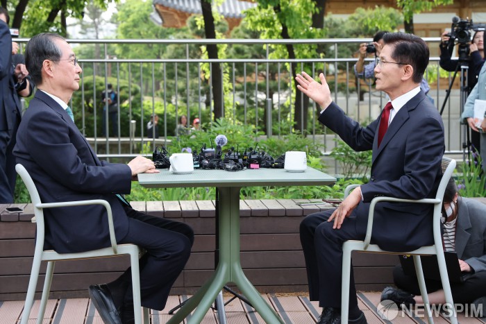 [서울=뉴스핌] 최지환 기자 = 김문수 국민의힘 대통령 후보와 한덕수 무소속 대선 예비후보가 8일 서울 여의도 국회 강변서재에서 후보 단일화 관련 공개 회동을 하고 있다. 2025.5.8 2025.05.08 choipix16@newspim.com