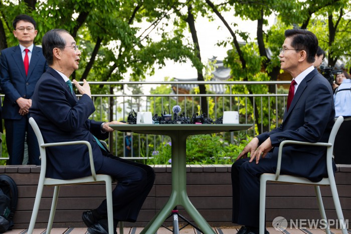 [서울=뉴스핌] 최지환 기자 = 김문수 국민의힘 대선 후보와 한덕수 예비후보가 8일 오후 국회 사랑재 카페에서 공개회동을 하고 있다. 2025.05.08 choipix16@newspim.com