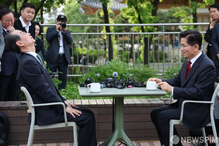[서울=뉴스핌] 최지환 기자 = 김문수 국민의힘 대선 후보와 한덕수 예비후보가 8일 오후 국회 사랑재 카페에서 공개회동을 하고 있다. 2025.05.08 choipix16@newspim.com