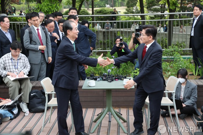 악수하며 공개회동 마친 김문수 - 한덕수