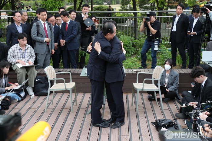 [서울=뉴스핌] 최지환 기자 = 김문수 국민의힘 대선 후보와 한덕수 무소속 대선 예비후보가 8일 국회 사랑재에서 만나 후보 단일화를 위한 2차 회동을 마친 뒤 포옹하고 있다. 2025.05.08 choipix16@newspim.com
