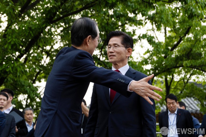 [서울=뉴스핌] 최지환 기자 = 김문수 국민의힘 대선 후보와 한덕수 무소속 대선 예비후보가 8일 국회 사랑재에서 만나 후보 단일화를 위한 2차 회동을 마친 뒤 포옹하고 있다. 2025.05.08 choipix16@newspim.com