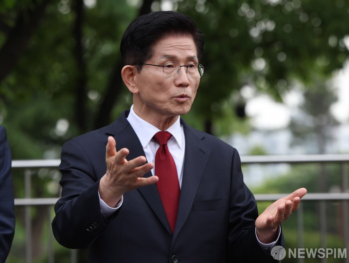 [서울=뉴스핌] 최지환 기자 = 김문수 국민의힘 대선 후보가 8일 서울 여의도 국회 사랑재의 한 카페에서 무소속 한덕수 대선 예비후보와 후보 단일화 관련 회동을 마친 뒤 취재진 질문에 답하고 있다. 2025.05.08 choipix16@newspim.com