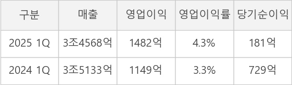 영업이익률을 자세히 살펴보면, 매출은 3조4568억으로 전년동기 대비해서 1.6% 감소한 반면, 영업이익은 1482억으로 29% 증가하였다. 매출은 크게 변하지 않았지만 영업이익이 증가하여 영업이익률도 상승한 것을 알 수 있다.