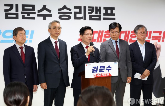 [서울=뉴스핌] 정일구 기자 = 김문수 국민의힘 대선 후보가 9일 오전 서울 여의도 선거캠프에서 북핵 억제력 강화 등 안보 관련 정책 발표를 하고 있다. 2025.05.09 mironj19@newspim.com