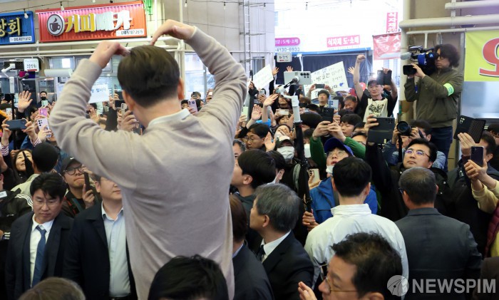 [성주=뉴스핌] 최지환 기자 = '골목골목 경청투어'에 나선 이재명 더불어민주당 대선후보가 9일 오후 경북 성주군 성주전통시장에서 시민들과 인사하고 있다. 2025.05.09 choipix16@newspim.com