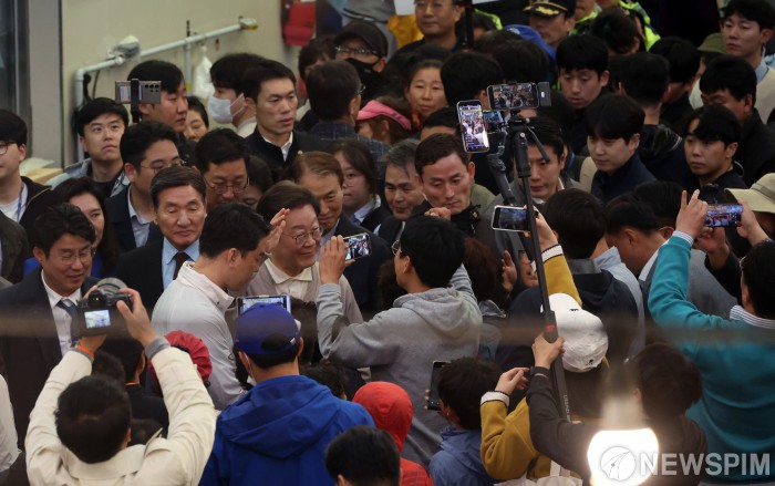 [성주=뉴스핌] 최지환 기자 = '골목골목 경청투어'에 나선 이재명 더불어민주당 대선후보가 9일 오후 경북 성주군 성주전통시장에서 시민들과 인사하고 있다. 2025.05.09 choipix16@newspim.com