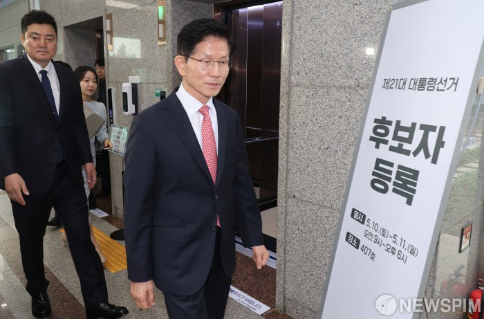 [서울=뉴스핌] 양윤모 기자 = 김문수 국민의힘 대선 후보가 11일 오전 경기도 과천 중앙선거관리위원회에서 제21대 대통령 선거 후보 등록을 마친 뒤 자리를 나서고 있다. 국민의힘은 10일 김문수 대선 후보를 한덕수 후보로 교체하는 찬반을 묻는 전 당원 투표결과, 반대 의견이 찬성보다 많아 부결됐다고 밝혔다. [공동취재] 2025.05.11 yym58@newspim.com