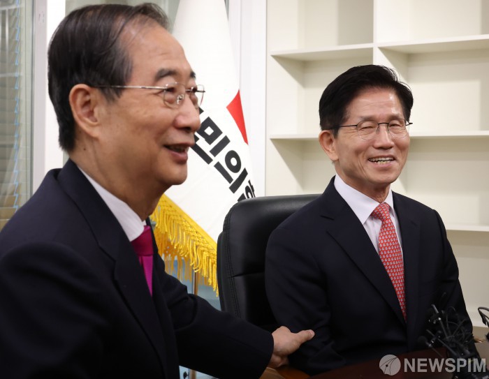 [서울=뉴스핌] 양윤모 기자 = 김문수 국민의힘 대선후보가 11일 오전 국민의힘 당사에서 열린 한덕수 국무총리와 회동하고 있다. 국민의힘은 10일 김문수 대선 후보를 한덕수 후보로 교체하는 찬반을 묻는 전 당원 투표결과, 반대 의견이 찬성보다 많아 부결됐다고 밝혔다. [공동취재] 2025.05.11 yym58@newspim.com