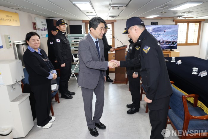 [서울=뉴스핌]이주호 대통령 권한대행 부총리 겸 교육부 장관이 11일 인천 중구 서해5도 특별경비단 3005함을 방문해, 봄철 꽃게 성어기를 맞아 강화된 불법조업 단속 현장을 점검하고, 승조원들을 격려하고 있다.[사진=교육부] 2025.05.11 photo@newspim.com