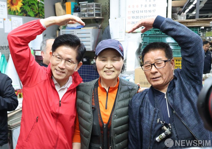 [서울=뉴스핌] 이호형 기자 = 김문수 국민의힘 대선 후보가 제21대 대통령선거 공식 선거운동 첫날인 12일 오전, 서울 송파구 가락시장을 찾아 상인들과 기념촬영을 하고 있다. 2025.05.12 leemario@newspim.com
