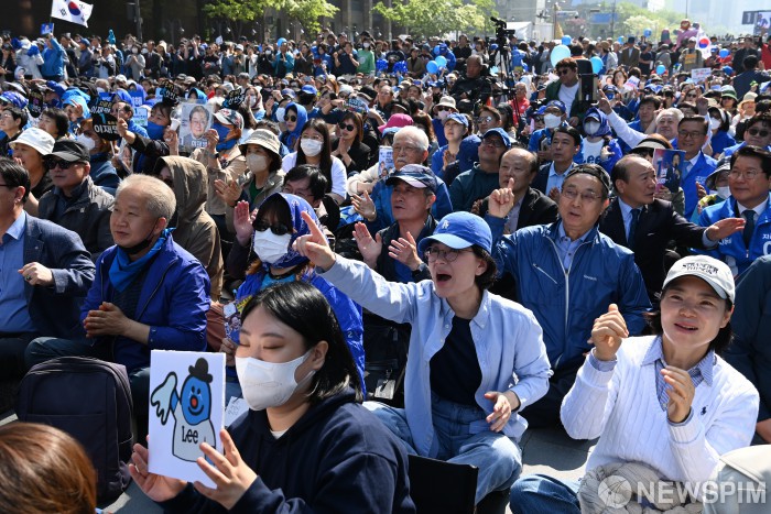 [서울=뉴스핌] 정일구 기자 = 제21대 대통령선거의 공식선거운동이 시작된 12일 오전 서울 청계광장에서 열린 더불어민주당 중앙선대위 출정식에서 시민들이 선거송에 맞춰 함성을 지르고 있다. 2025.05.12 mironj19@newspim.com