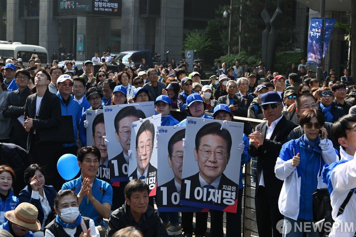 [서울=뉴스핌] 정일구 기자 = 제21대 대통령선거의 공식선거운동이 시작된 12일 오전 서울 청계광장에서 열린 더불어민주당 중앙선대위 출정식에서 시민들이 선거송에 맞춰 함성을 지르고 있다. 2025.05.12 mironj19@newspim.com