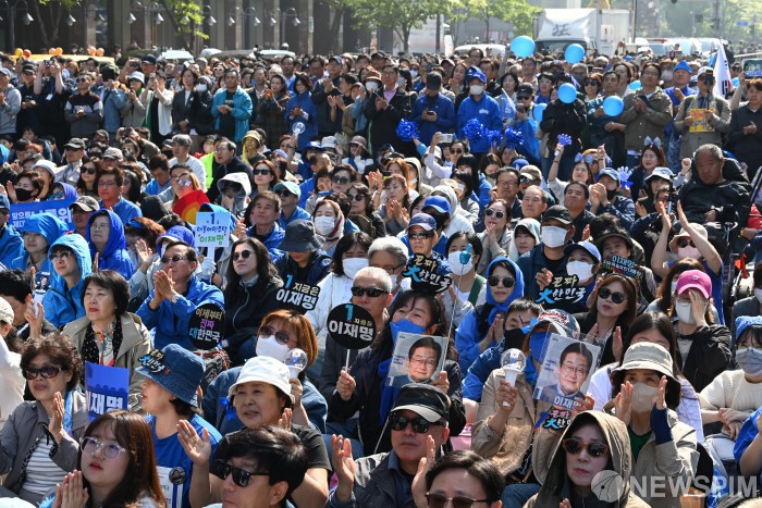 [서울=뉴스핌] 정일구 기자 = 제21대 대통령선거의 공식선거운동이 시작된 12일 오전 서울 청계광장에서 열린 더불어민주당 중앙선대위 출정식에서 시민들이 선거송에 맞춰 함성을 지르고 있다. 2025.05.12 mironj19@newspim.com