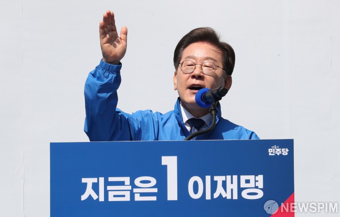 [서울=뉴스핌] 정일구 기자 = 제21대 대통령선거 공식 선거운동 첫날인 12일 오전 서울 종로구 청계광장에서 열린 출정식 및 첫 유세에서 이재명 더불어민주당 대선 후보가 출사표를 밝히고 있다. 2025.05.12 mironj19@newspim.com