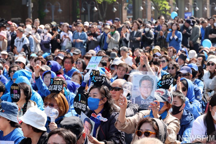 [서울=뉴스핌] 정일구 기자 = 이재명 더불어민주당 대선 후보가 12일 오전 서울 광화문 청계광장에서 첫번째 선거 유세를 시작한 가운데 지지자들이 환호하고 있다. 2025.05.12 mironj19@newspim.com