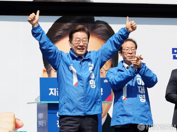[서울=뉴스핌] 정일구 기자 = 제21대 대통령선거 공식 선거운동 첫날인 12일 오전 서울 종로구 청계광장에서 열린 출정식 및 첫 유세에서 이재명 더불어민주당 대선 후보가 지지자들을 향해 인사하고 있다. 2025.05.12 mironj19@newspim.com