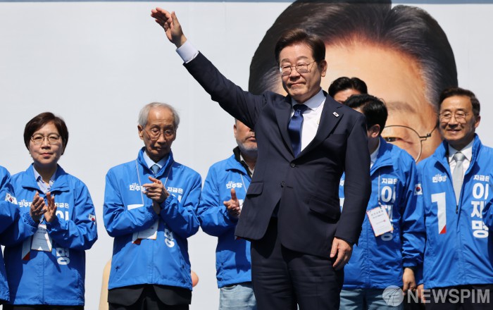 [서울=뉴스핌] 정일구 기자 = 이재명 더불어민주당 대선 후보가 12일 오전 서울 청계광장에서 열린 중앙선거대책위원회 출범식 및 첫 유세에서 지지자들을 향해 손을 흔들고 있다. 2025.05.12 mironj19@newspim.com