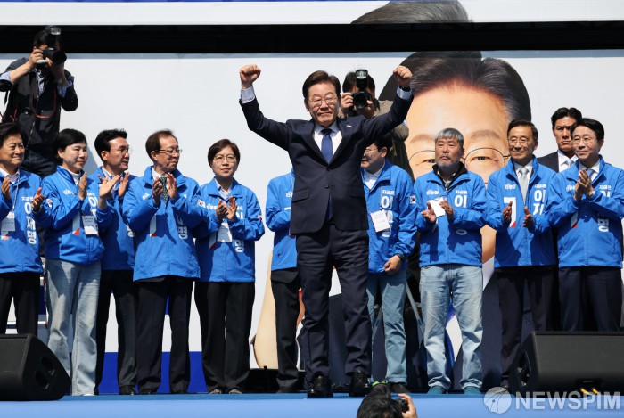 [서울=뉴스핌] 정일구 기자 = 이재명 더불어민주당 대선 후보가 12일 오전 서울 청계광장에서 열린 중앙선거대책위원회 출범식 및 첫 유세에서 지지자들을 향해 손을 흔들고 있다. 2025.05.12 mironj19@newspim.com