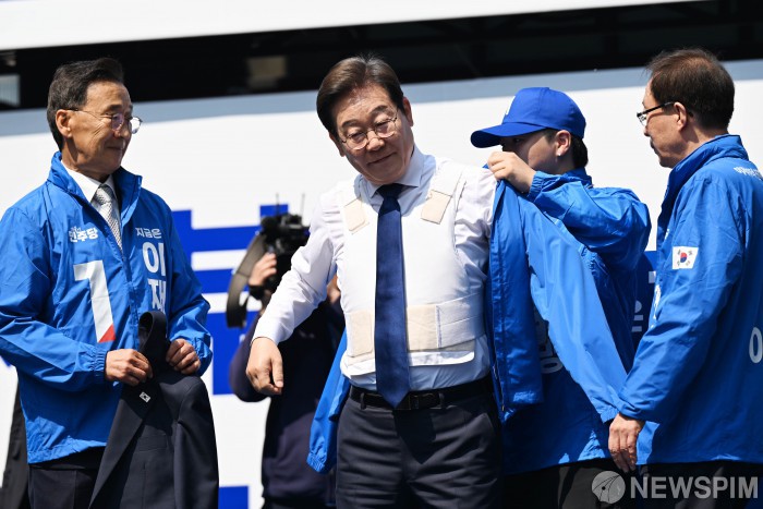 [서울=뉴스핌] 정일구 기자 = 이재명 더불어민주당 대통령 후보가 제21대 대통령선거 공식 선거운동이 시작된 12일 서울 종로구 청계광장에서 열린 중앙선거대책위원회 출정식에서 방탄복 위에 선거 운동복을 입고 있다. 2025.05.12 mironj19@newspim.com
