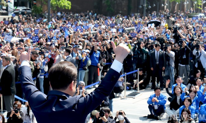 [서울=뉴스핌] 정일구 기자 = 이재명 더불어민주당 대선후보가 12일 서울 청계광장 첫 유세에서 손을 들어 인사하고 있다. 2025.05.12 mironj19@newspim.com