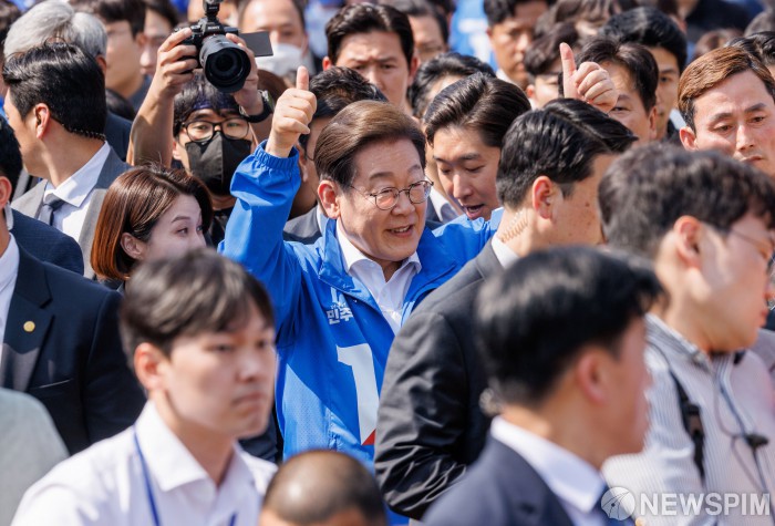 [화성=뉴스핌] 김학선 기자 = 이재명 더불어민주당 대통령 후보가 12일 오후 경기 화성 동탄 센트럴파크 음악분수중앙광장에서 시민들에게 인사하며 유세장을 향하고 있다. 2025.05.12 yooksa@newspim.com