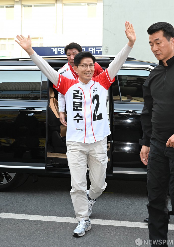 [대구=뉴스핌] 최지환 기자 = 김문수 국민의힘 대선후보가 12일 대구 서문시장을 방문해 지지자들을 향해 손을 흔들고 있다. 2025.05.12 choipix16@newspim.com