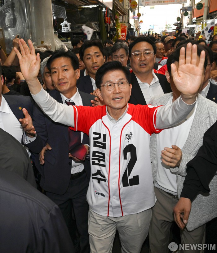 [대구=뉴스핌] 최지환 기자 = 김문수 국민의힘 대선후보가 12일 대구 서문시장을 방문해 지지자들을 향해 손을 흔들고 있다. 2025.05.12 choipix16@newspim.com