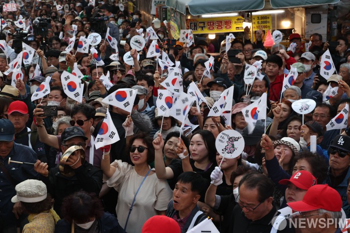[대구=뉴스핌] 최지환 기자 = 12일 오후 대구 중구 서문시장 김문수 국민의힘 대선후보 유세현장에서 시민들이 태극기를 흔들고 있다. 2025.05.12 choipix16@newspim.com