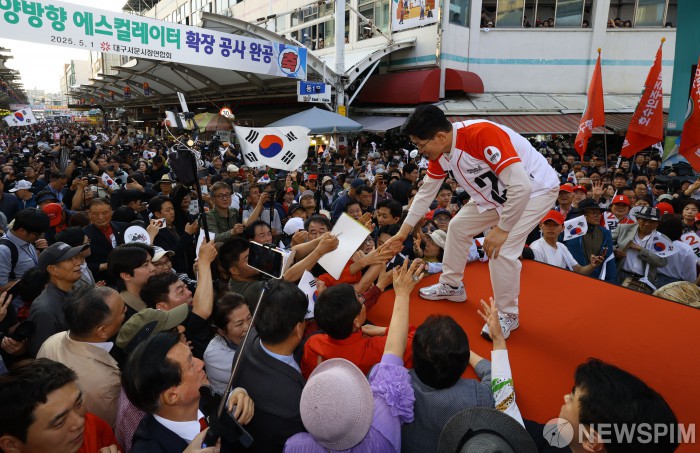[대구=뉴스핌] 최지환 기자 = 김문수 국민의힘 대선후보가 12일 오후 대구 중구 서문시장 유세현장에서 시민들과 인사하고 있다. 2025.05.12 choipix16@newspim.com