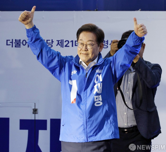 [대전=뉴스핌] 정일구 기자 =이재명 더불어민주당 대선 후보가 6·3 대통령선거 공식 선거운동 첫날인 12일 오후 대전 중구 으능정이거리 스카이로드에서 열린 'K-과학기술' 대전 유세에 참석해 시민들에게 인사하고 있다. 2025.05.12 mironj19@newspim.com