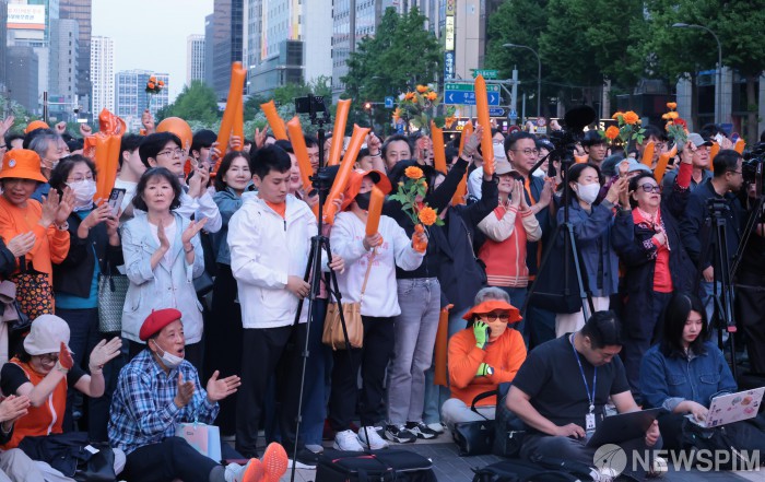 [서울=뉴스핌] 이길동 기자 =12일 오후 서울 중구 청계광장에서 열린 이준석 개혁신당 대선후보의 출정식에서 시민들이 이 후보의 연설에 환호하고 있다 2025.05.12 gdlee@newspim.com