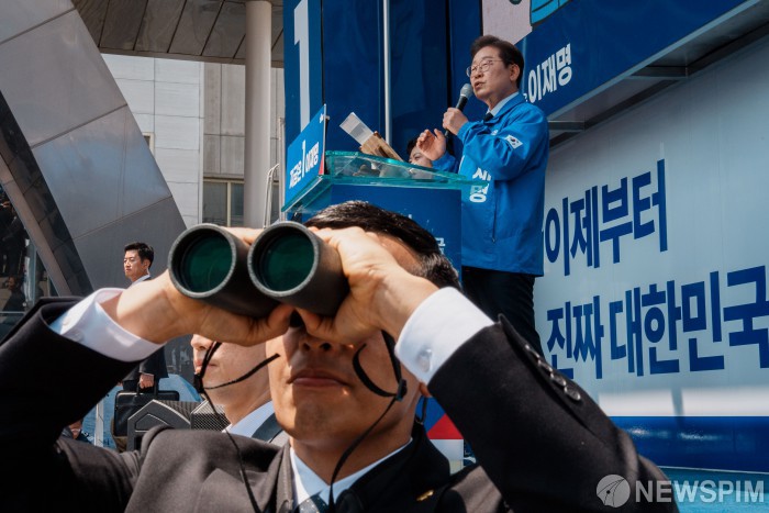 [구미=뉴스핌] 정일구 기자 = 이재명 더불어민주당 대선후보의 유세가 열린 13일 오전 경북 구미역 앞에서 한 경호원이 쌍안경을 들고 주변을 살피고 있다. 2025.05.13 mironj19@newspim.com
