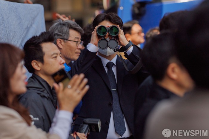 [구미=뉴스핌] 정일구 기자 = 이재명 더불어민주당 대선후보의 유세가 열린 13일 오전 경북 구미역 앞에서 한 경호원이 쌍안경을 들고 주변을 살피고 있다. 2025.05.13 mironj19@newspim.com