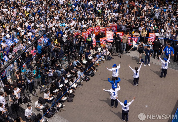 [대구=뉴스핌] 정일구 기자 = 이재명 더불어민주당 대선후보가 13일 오후 대구 동성로를 찾아지지를 호소한 가운데 응원단이 춤을 추고 있다. 2025.05.13 mironj19@newspim.com