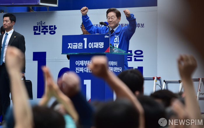 [대구=뉴스핌] 정일구 기자 = 이재명 더불어민주당 대선후보가 대구·경북 지역 유세에 돌입한 13일 오후 대구 동성로에서 시민들에게 지지를 호소하고 있다. 2025.05.13 mironj19@newspim.com