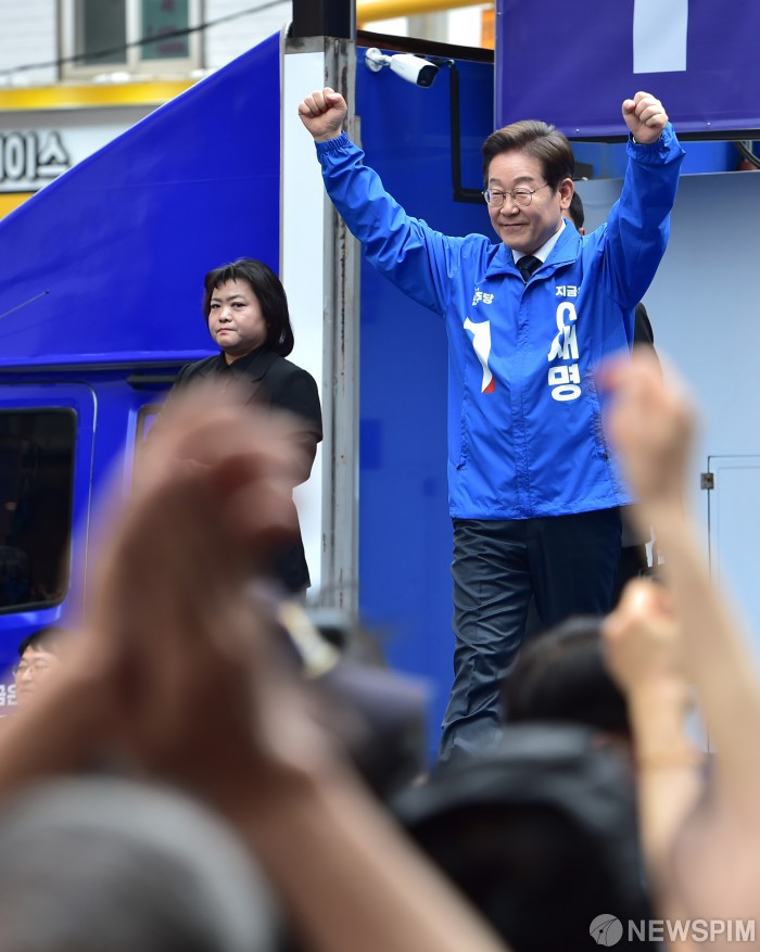 [대구=뉴스핌] 정일구 기자 = 이재명 더불어민주당 대선후보가 대구·경북 지역 유세에 돌입한 13일 오후 대구 동성로에서 시민들에게 지지를 호소하고 있다. 2025.05.13 mironj19@newspim.com