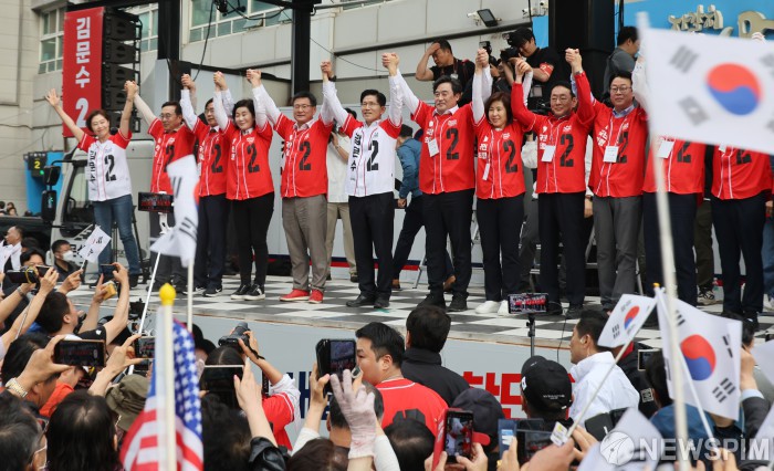 [부산=뉴스핌] 최지환 기자 = 김문수 국민의힘 대선 후보가 13일 오후 부산 중구 자갈치 시장에서 열린 유세에서 지지를 호소하고 있다. 2025.05.13 choipix16@newspim.com
