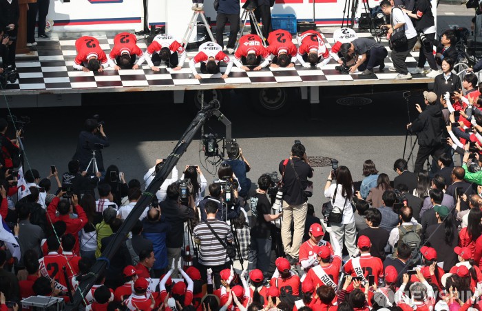 [진주=뉴스핌] 최지환 기자 = 김문수 국민의힘 대선후보가 14일 오전 경남 진주시 진주대로 광미사거리에서 열린 선거유세에서 시민들에게 큰 절을 하고 있다. 2025.05.14 choipix16@newspim.com