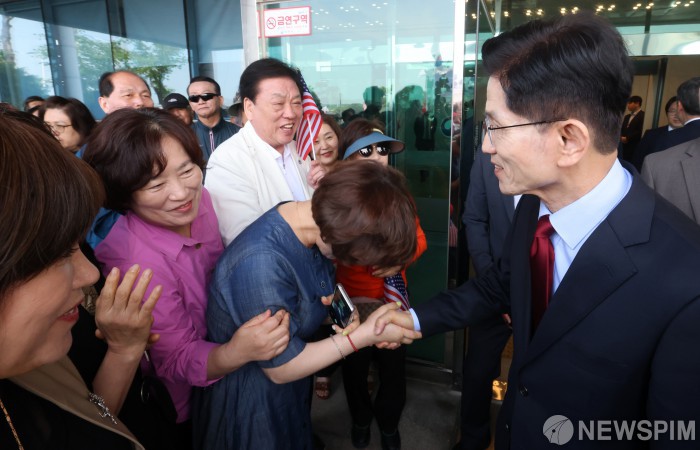 [사천=뉴스핌] 최지환 기자 = 김문수 국민의힘 대선 후보가 14일 오전 경남 사천시 우주항공청에서 간담회를 마치고 사천 시민 및 지지자들과 인사를 나누고 있다. 2025.05.14 choipix16@newspim.com