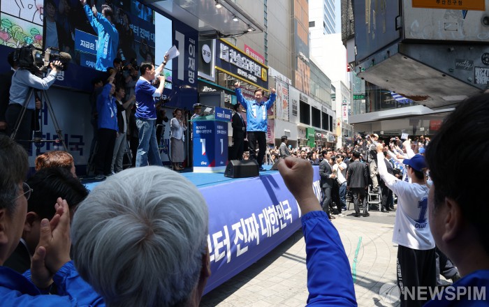 [부산=뉴스핌] 정일구 기자 = 이재명 더불어민주당 대선 후보가 14일 부산 서면 쥬디스태화 인근에서 열린 부산 유세에 참석해 시민들에게 인사하고 있다. 2025.05.14 mironj19@newspim.com
