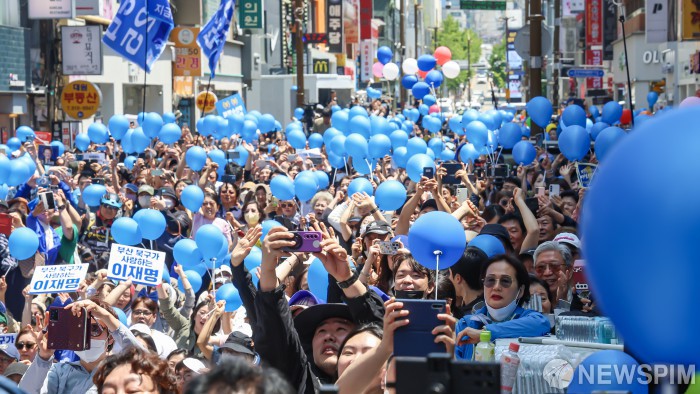 [부산=뉴스핌] 정일구 기자 = 이재명 더불어민주당 대선 후보 지지자들이 14일 부산 부산진구 서면 쥬디스태화 옆 거리에서 열린 유세에서 환호하고 있다. 2025.05.14 mironj19@newspim.com